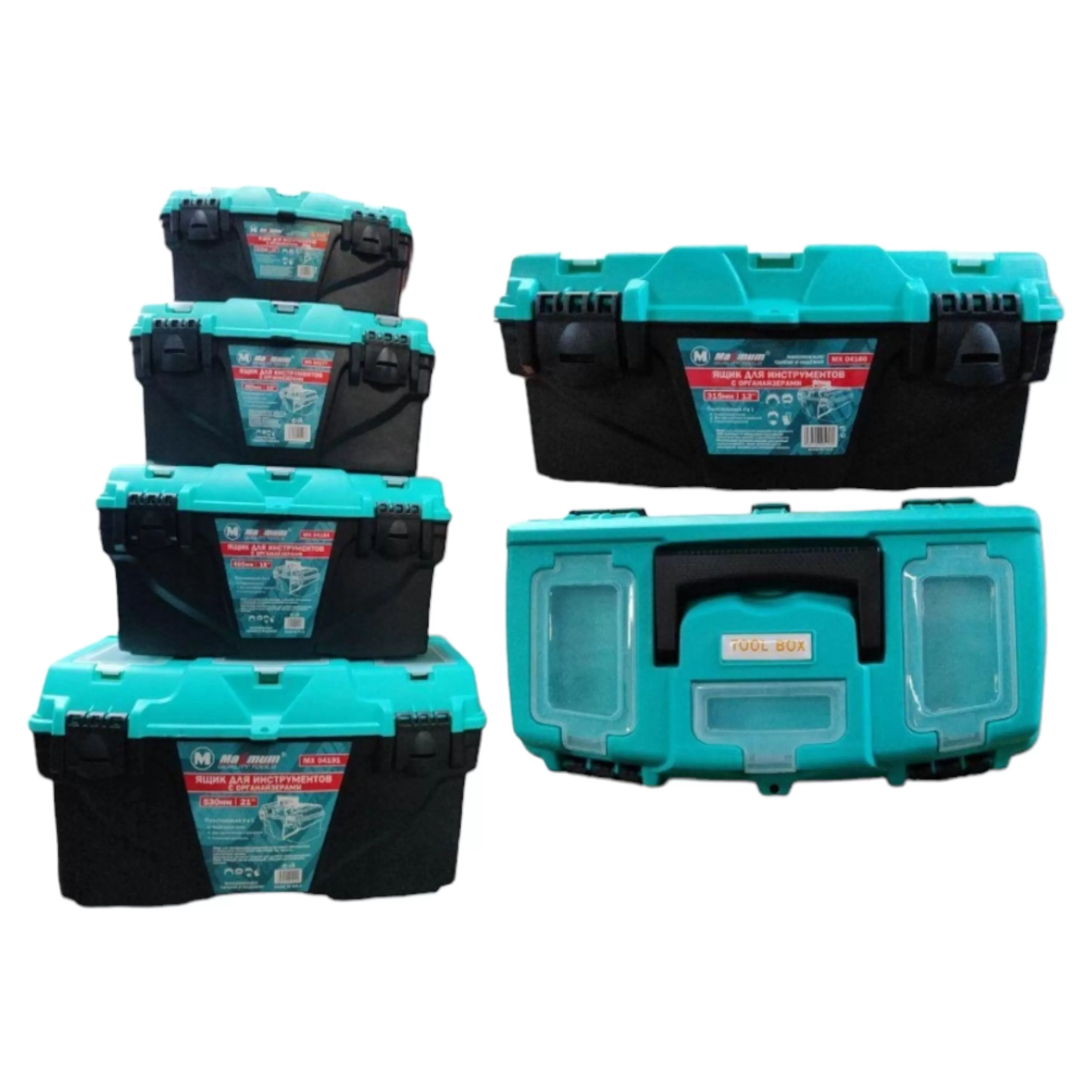 Набор ящиков для хранения инструментов включает в себя 4 комплекта для простого и безопасного хранения молотков, пил, стамесок, ответок и прочих метких деталей для ремонта. Каждый ящик оборудован внутренним подвижным лотком с рукояткой и тремя внешними небольшими прозрачными органайзерами. Инструментальные ящики-органайзеры имеют по два специальных надежных замка и удобную, прочную ручку для переноски. Габариты ящиков (внешние):